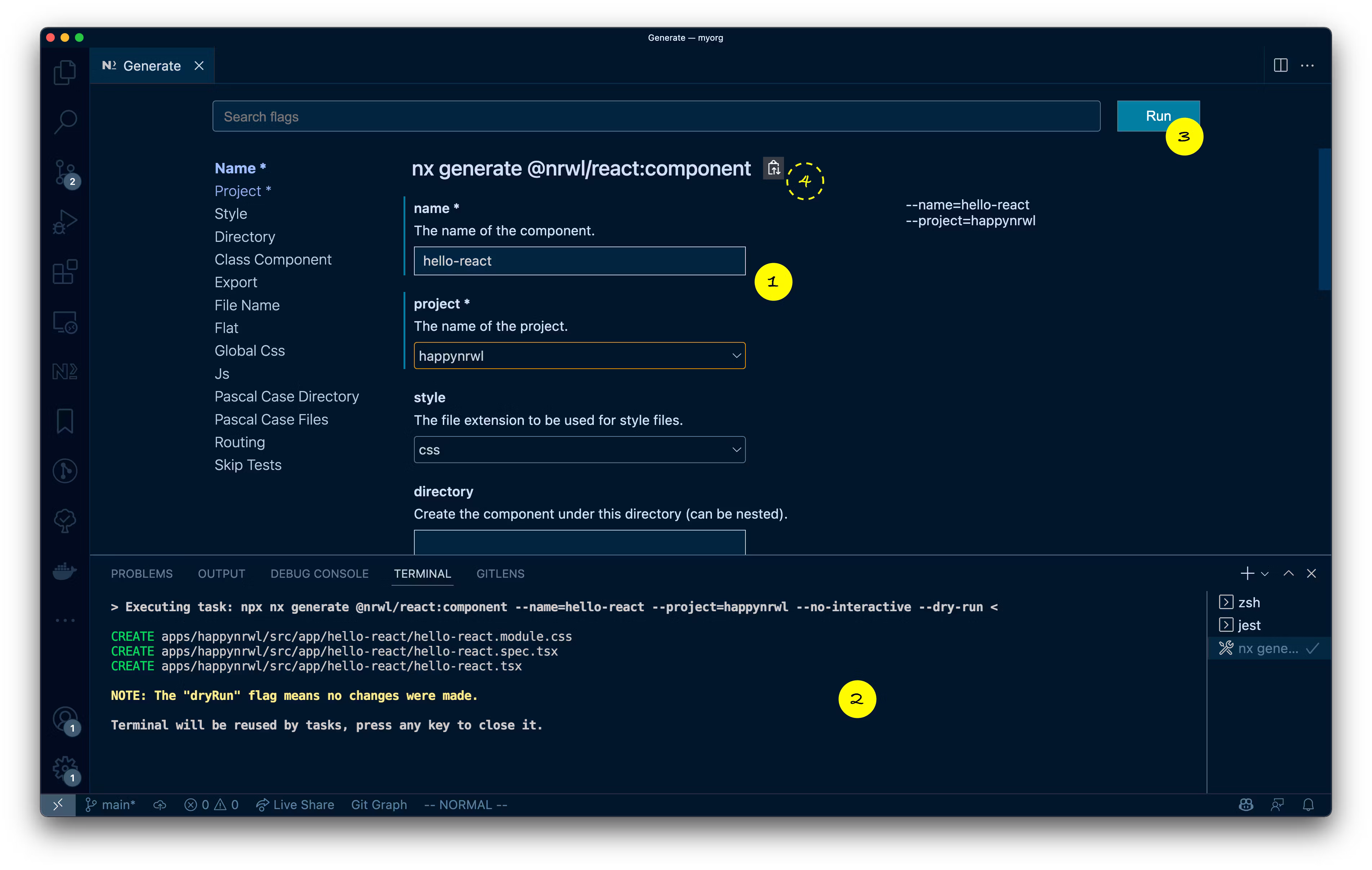 - (3) shows additional commands that are commonly used in an Nx workspace. Feel free to click and explore them.