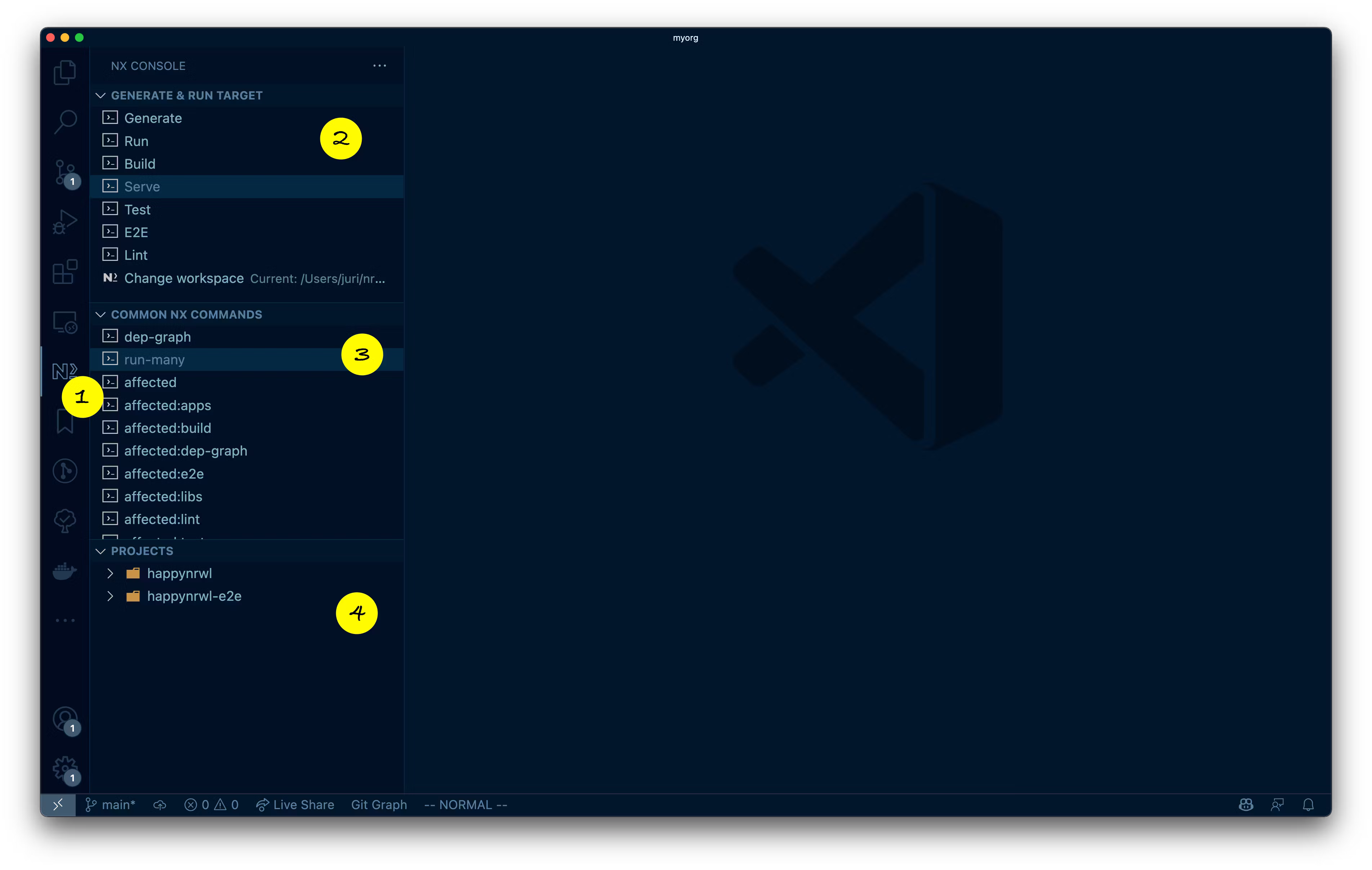 Once you have the extension installed, you can click its icon in the VSCode Activity Bar (1) which reveals the Nx Console UI.