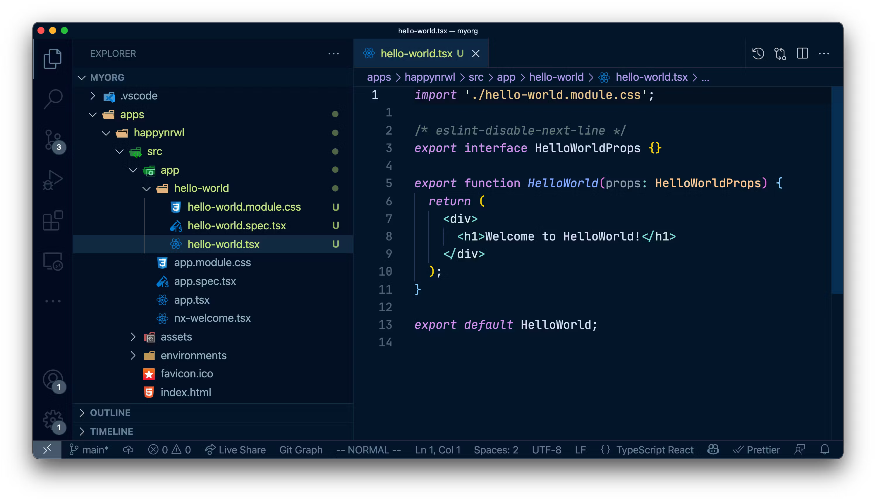 npx nx generate @nrwl/react:component HelloWorldThis generates a new component in our happynrwl application