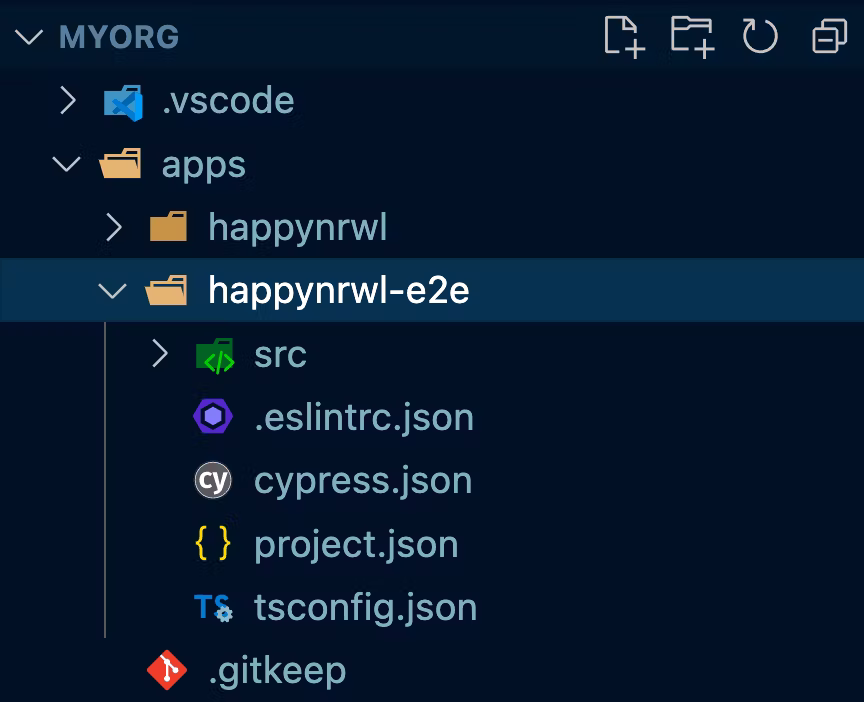 Whenever you generate a new project in an Nx workspace, you have the option to automatically also create a Cypress-based e2e project alongside it. In our case, it is called happynrwl-e2e.