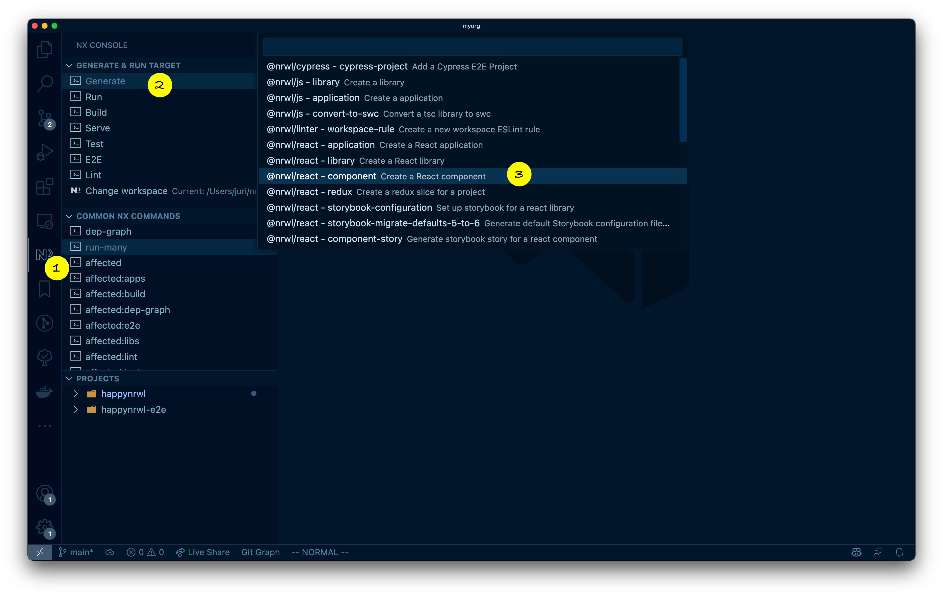 - (2) is the panel where you see a fixed command "Generate" to invoke the Nx generator for creating new projects, libraries etc as we mentioned before. In addition you see a list of available commands to run.