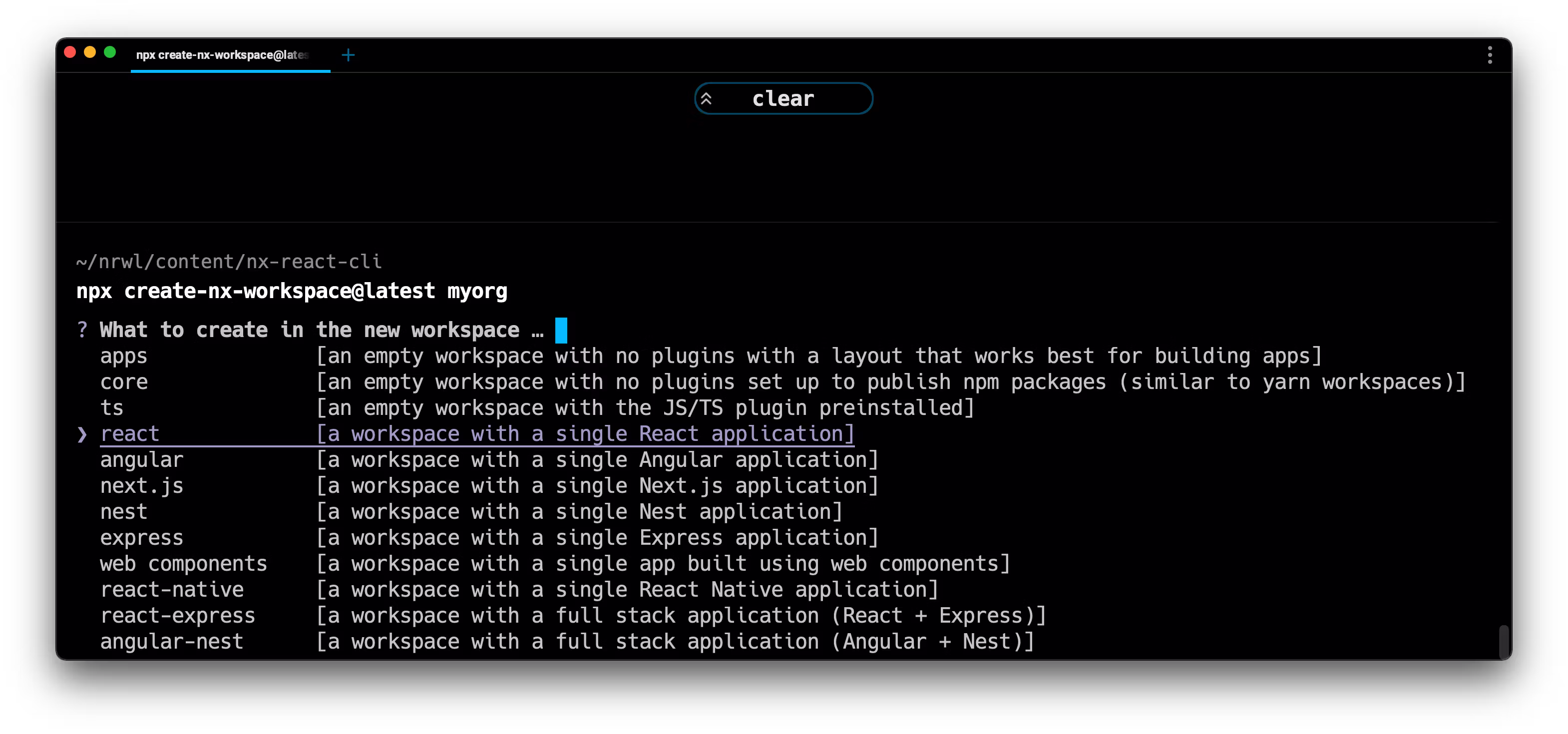npx create-nx-workspace@latest myorgNote, I'm using