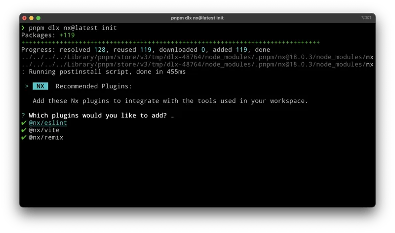 pnpm dlx nx@latest init(use npx nx@latest init in a NPM workspace)