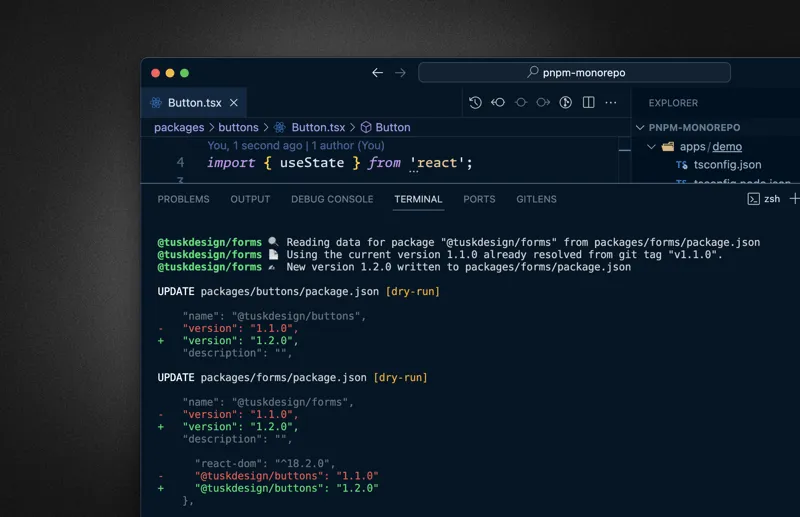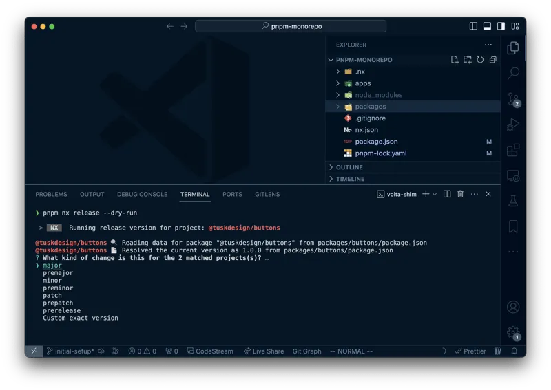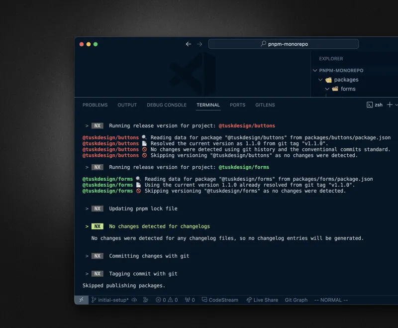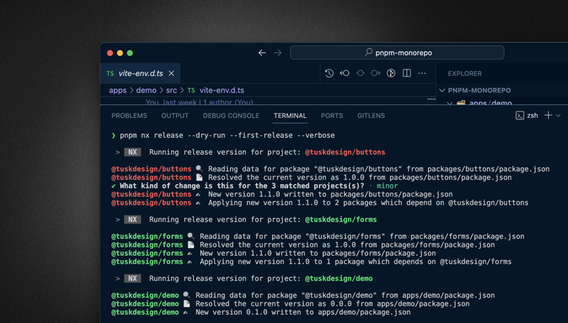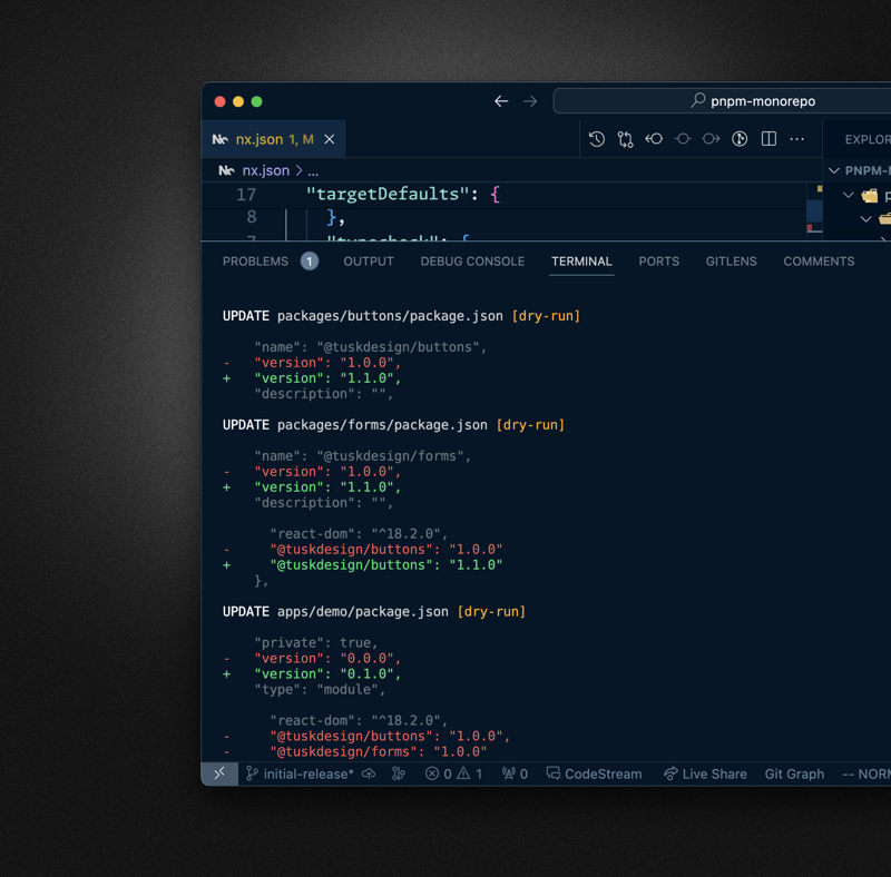 pnpm nx release --first-releaseYou can skip the release part when prompted for now. Check how the workspace got updated, incrementing the package.json version property and updating the version on the package dependency definition, i.e. the @tuskdesign/buttons version got updated in the @tuskdesign/forms package.json.