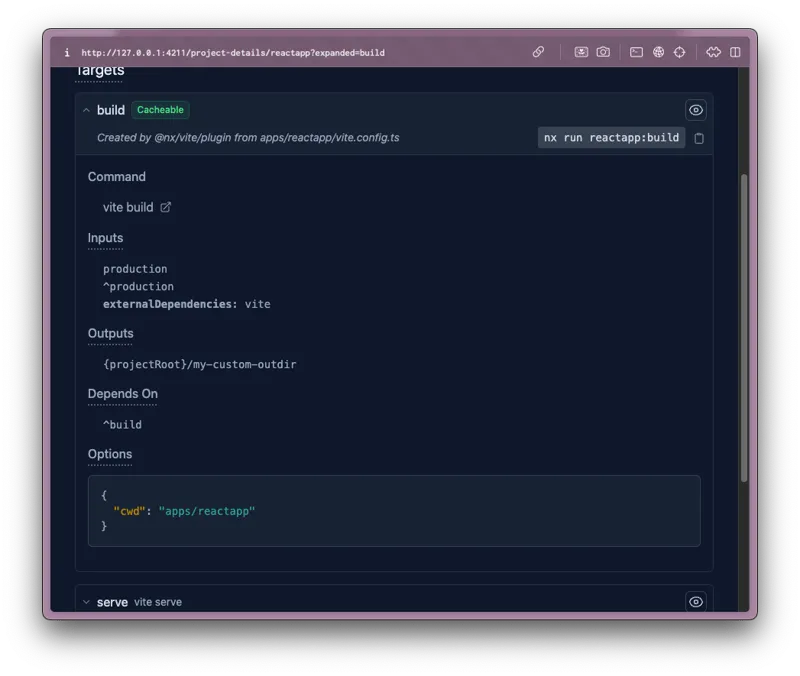 }Notice the options property defining the names of the potentially inferred targets for each plugin. These targets will be generated dynamically s.t. you can still run nx build reactapp even though there's no build target explicitly defined in the project.json of your apps/reactapp project.